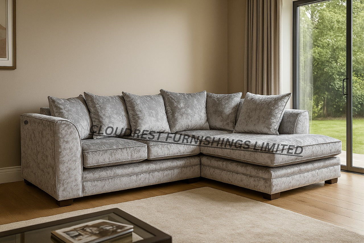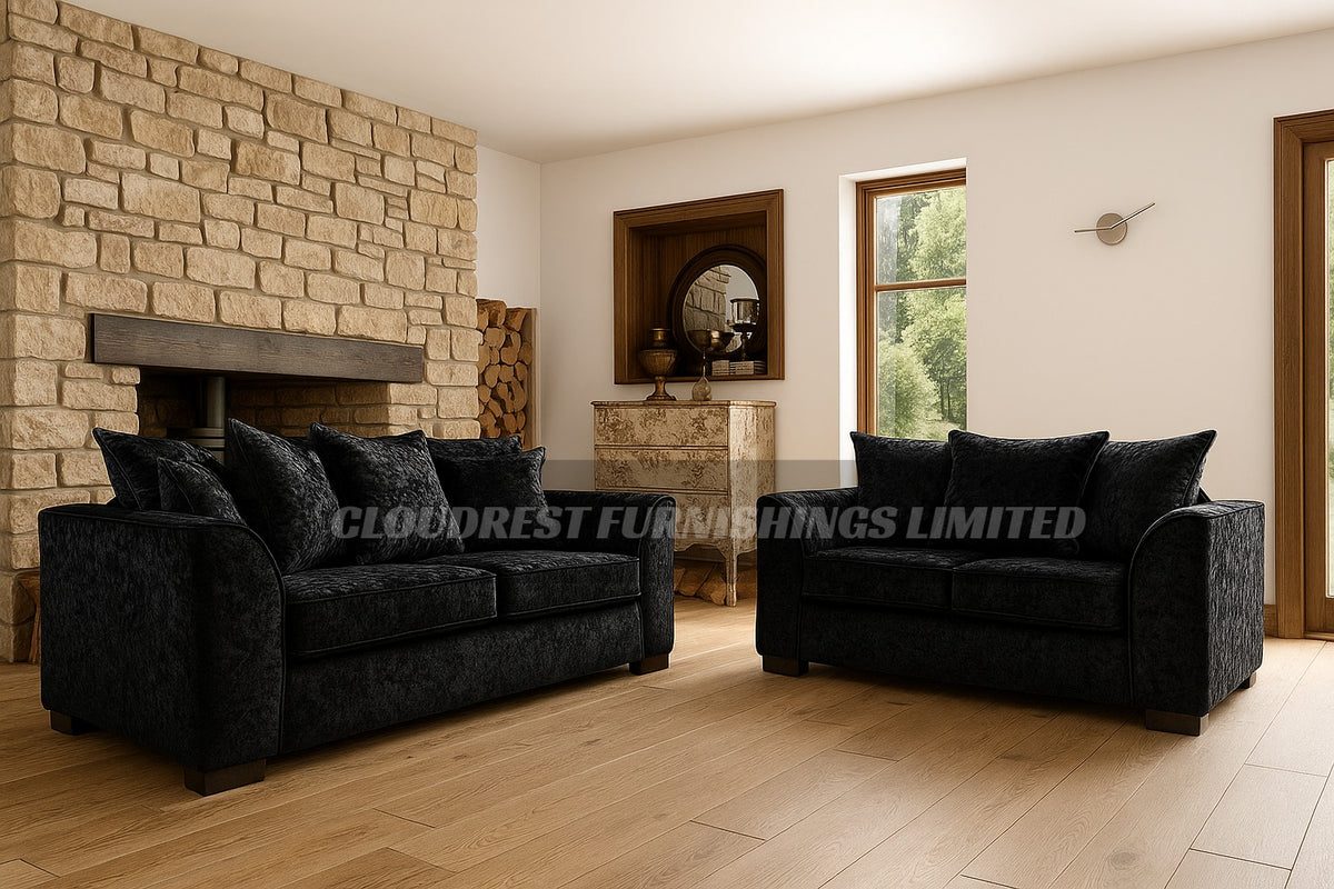 Transform your home with the Dylan Crushed Velvet Silver + Black UK Sofa. Experience luxurious design and exceptional comfort today!